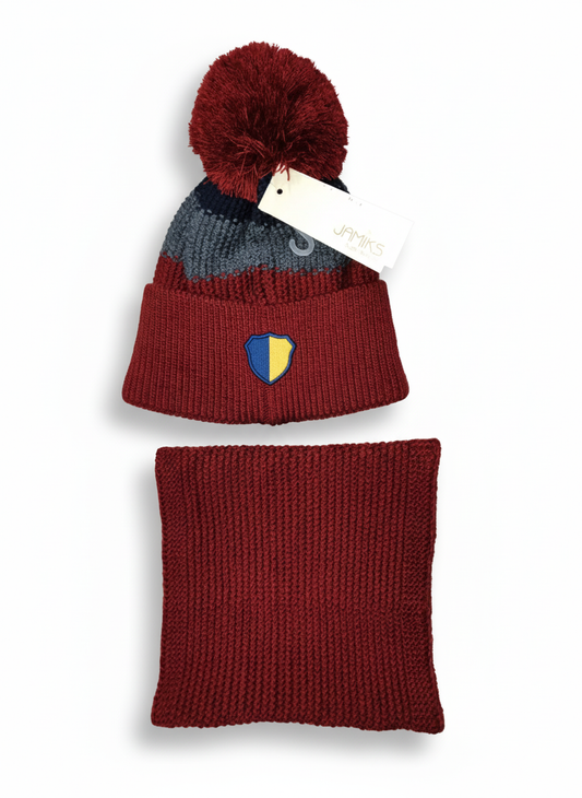 Un set caldo e stiloso pensato per affrontare l’inverno con grinta e comfort. Il cappello in maglia bicolore blu e bordeaux, con pon pon voluminoso e patch ricamata a scudo, è perfetto per proteggere dal freddo con un tocco sportivo. Il collo coordinato in maglia bordeaux, morbido e avvolgente, completa il look con praticità. Un accessorio ideale per bambini attivi, da indossare a scuola, in montagna o nel tempo libero.