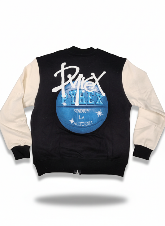Un classico dello streetwear reinterpretato in chiave baby. La felpa college PYREX con zip frontale è realizzata in cotone felpato caldo e morbido, ideale per le stagioni più fresche. Il design bicolore con maniche bianche e corpo nero, abbinato alla vestibilità over, dona un look deciso e contemporaneo. La stampa grafica sul retro aggiunge carattere e riconoscibilità, perfetta per piccoli trendsetter.