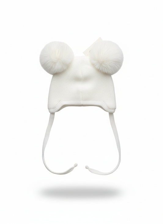 Un accessorio invernale dal design tenero e funzionale, pensato per proteggere i più piccoli con stile. Il cappello Jamiks è realizzato in maglia morbida color panna, con doppio pon pon in pelliccia sintetica che ricorda le orecchie di un orsetto. Le paraorecchie e i laccetti garantiscono una vestibilità sicura e calda, mentre la fodera interna in cotone assicura comfort e delicatezza sulla pelle. Il piccolo emblema metallico Jamiks sul fronte aggiunge un tocco elegante e discreto.