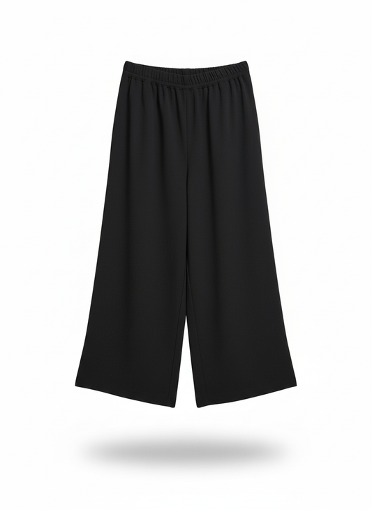 Un capo elegante e comfy pensato per le ragazze che amano un look sofisticato anche nel quotidiano. Il pantalone palazzo Akyta è realizzato in felpa nera morbida, con gamba ampia e vita elasticizzata per una vestibilità rilassata. Il dettaglio distintivo è la fascia laterale in pizzo nero, impreziosita da strisce bianche a contrasto, che dona un tocco chic e urban. Perfetto per outfit casual, sporty o da cerimonia con un twist glamour.