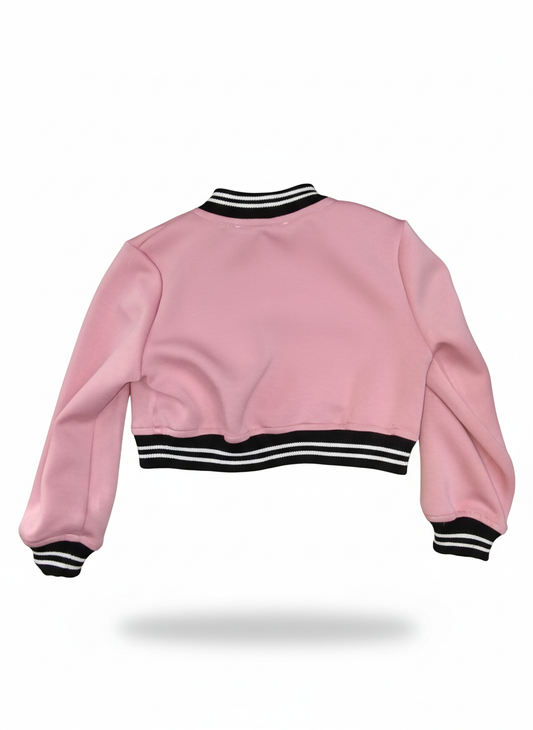 Un capo sporty-chic perfetto per le piccole trendsetter. La felpa bomber Naice è realizzata in tessuto morbido rosa, con una silhouette cropped e dettagli ispirati allo stile varsity americano. Le maniche leggermente a sbuffo, il colletto e i bordi a costine rigate in nero e bianco, e l’abbottonatura frontale con bottoni a pressione dorati donano carattere e originalità. Le tasche frontali con patta completano il look con funzionalità e stile.