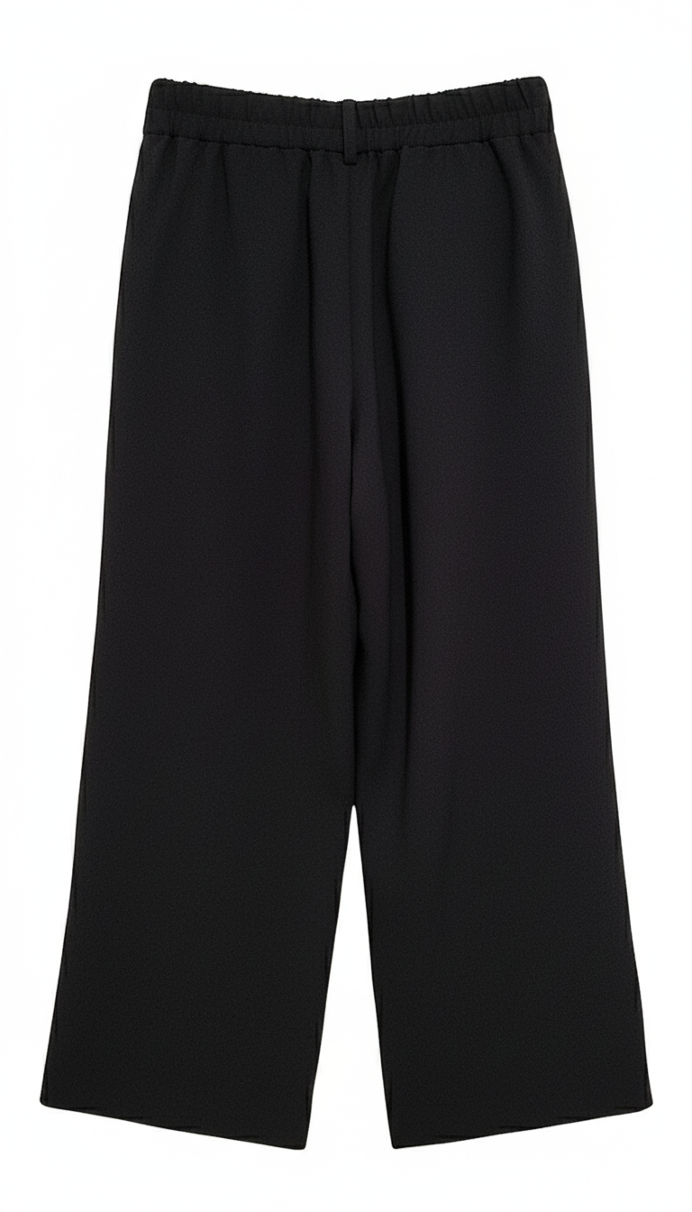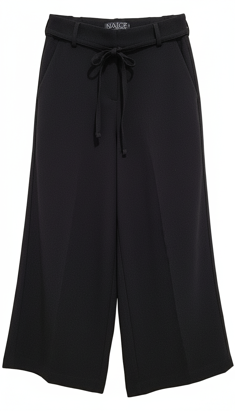 Pantaloni a gamba larga da ragazza in tessuto nero strutturato, con vita alta e cintura in tessuto annodata sul davanti. Il taglio flare dona slancio alla silhouette, mentre le tasche laterali e i passanti in vita aggiungono funzionalità e stile. Perfetti per outfit casual-chic o eleganti, da abbinare a crop top, bluse satinate o felpe grafiche per un look deciso e versatile.