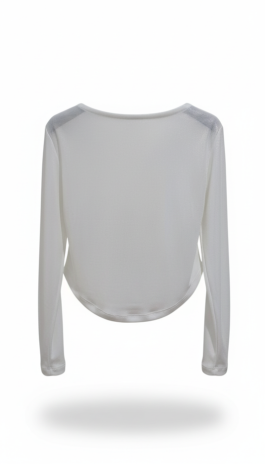 Maglia da ragazza in tessuto lycra bianco, con pannello centrale in tulle arricciato che crea texture e movimento. Il contrasto tra il corpo in cotone e il dettaglio trasparente dona al capo un look sofisticato e contemporaneo. Perfetto per outfit minimal-chic o street-style, da abbinare a gonne a pieghe, pantaloni flare o denim a vita alta. Un capo versatile che gioca con volumi e trasparenze.