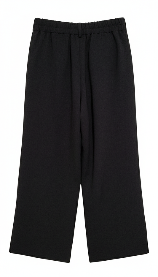 Pantaloni a gamba larga da ragazza in tessuto nero strutturato, con vita alta e cintura in tessuto annodata sul davanti. Il taglio flare dona slancio alla silhouette, mentre le tasche laterali e i passanti in vita aggiungono funzionalità e stile. Perfetti per outfit casual-chic o eleganti, da abbinare a crop top, bluse satinate o felpe grafiche per un look deciso e versatile.