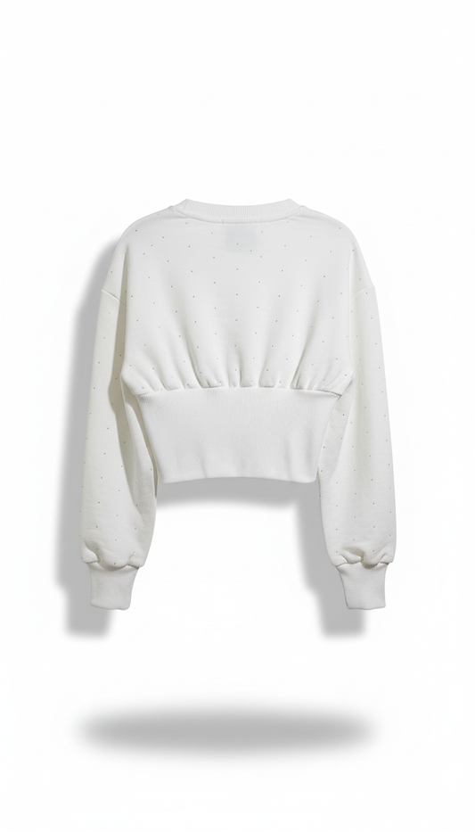 Felpa corta da ragazza in tessuto bianco con texture a costine e arricciatura centrale sotto il petto. Il dettaglio luminoso di micro strass distribuiti su maniche e busto dona luce e personalità al capo, perfetto per look comfy-chic con un tocco sparkling. Il taglio cropped e il fondo elasticizzato la rendono ideale da abbinare a gonne a pieghe, pantaloni flare o jeans a vita alta. Un capo versatile che unisce comfort e stile.