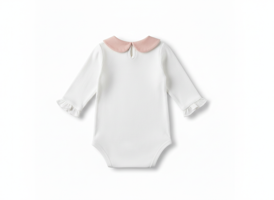 Un capo raffinato e confortevole pensato per le più piccole. Il body baby Nalú è realizzato in caldo cotone bianco, ideale per le stagioni più fresche. Il colletto in vellutino rosa cipria dona un tocco romantico e delicato, mentre le maniche lunghe con rouge aggiungono eleganza e movimento. Dotato di bottoncini sul retro e sul fondo, è pratico da indossare e perfetto per completare outfit da cerimonia o look quotidiani chic.