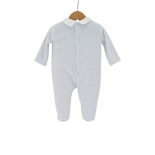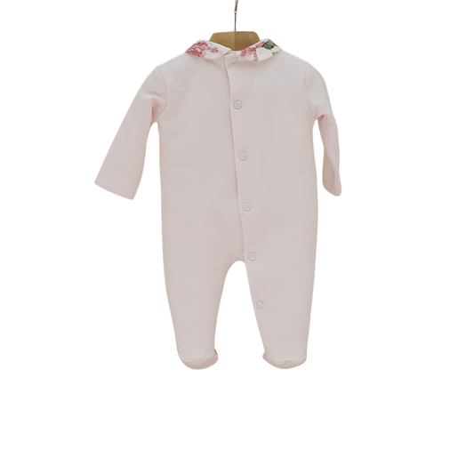 Questa tutina in ciniglia è realizzata con un tessuto soffice e caldo, ideale per le stagioni più fresche. Il colletto classico e i dettagli curati donano un tocco raffinato, perfetto per le prime uscite, le foto ricordo o semplicemente per coccolarsi con stile.