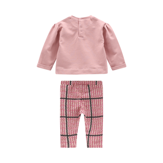 Tuta 2 pezzi per bambina in felpa stretch, composta da leggings con motivo a quadri allover e maglia girocollo con maniche a sbuffo. I dettagli frontali della maglia aggiungono un tocco vezzoso e originale, mentre l’apertura con bottoncini sul retro garantisce praticità. Un completo perfetto per muoversi con libertà e personalità.