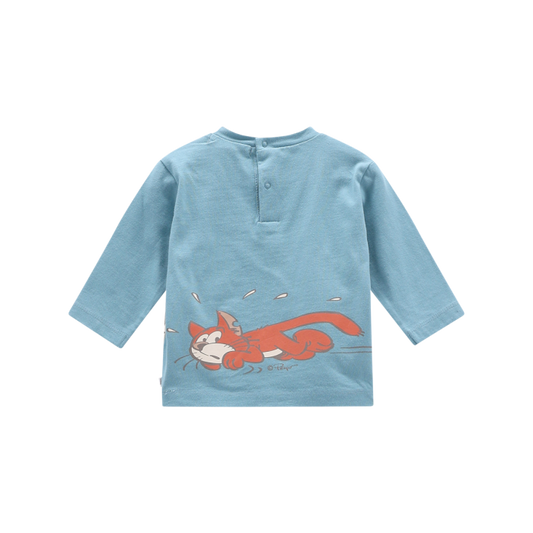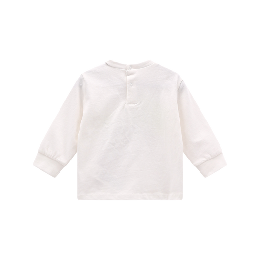 T-shirt girocollo a maniche lunghe in jersey invernale, morbida e tinta unita, con una stampa frontale in rilievo dedicata ai mitici Puffi™. L’apertura con bottoncini sul retro rende il cambio facile e veloce. Un capo comodo e divertente, perfetto per accompagnare ogni piccola avventura.